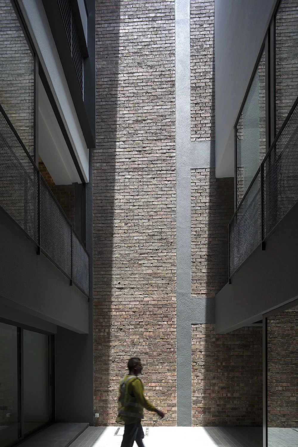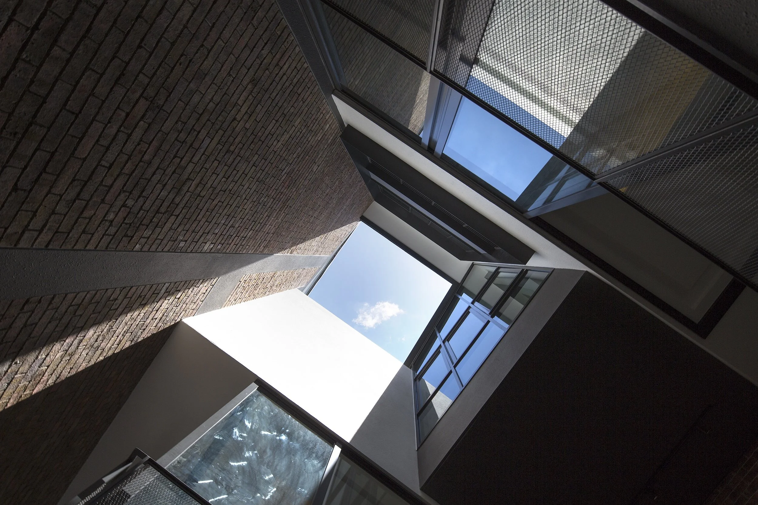 The long and deep plan suggested the familiar courtyard type for light and air, albeit usually still air. To encourage cross ventilation, the glass boxes are pushed to abut one party wall, opening up 1.2m wide slots on the opposite side. They link through the central courtyard to form a through air passage that penetrates the house from front to rear.