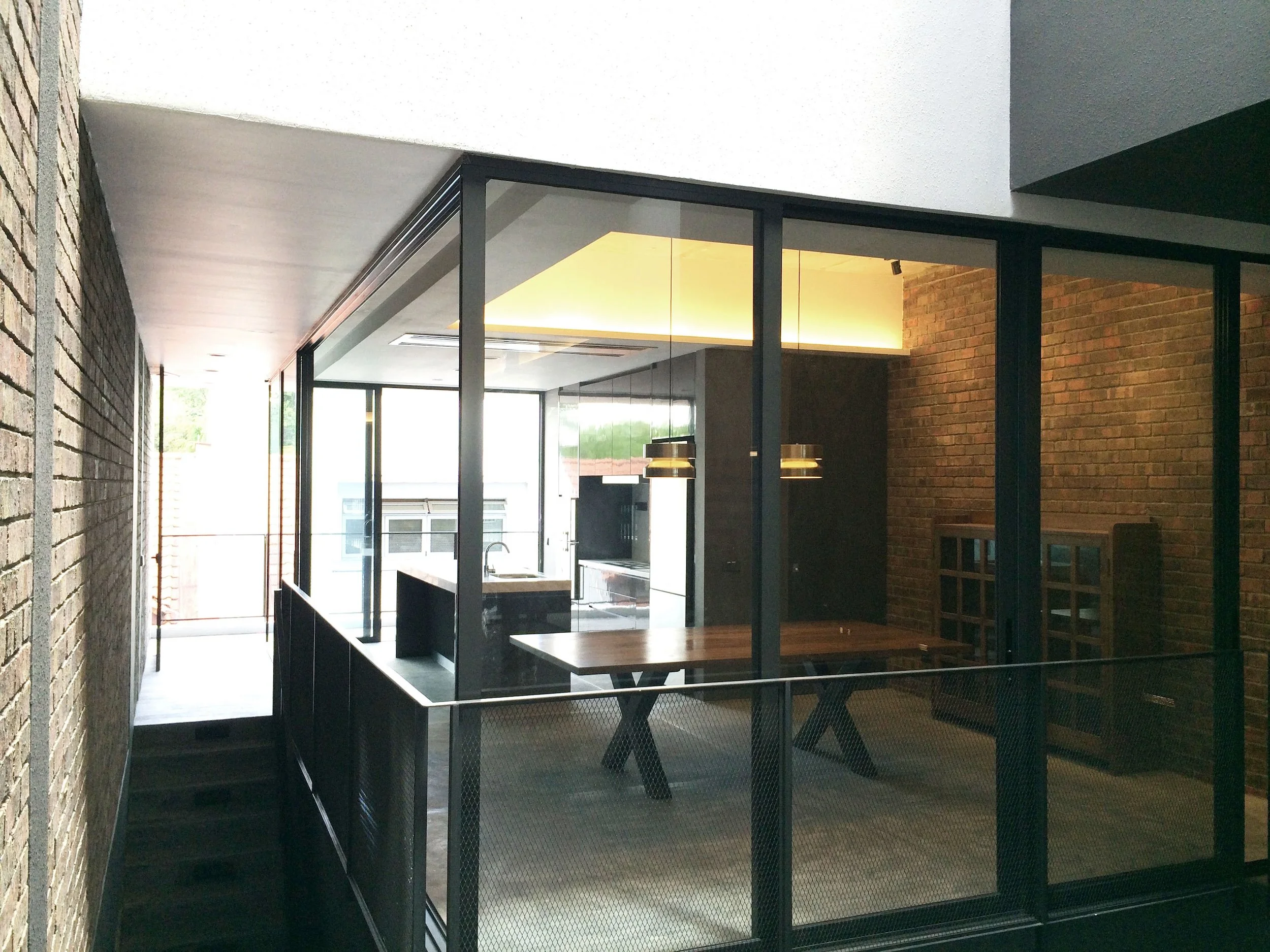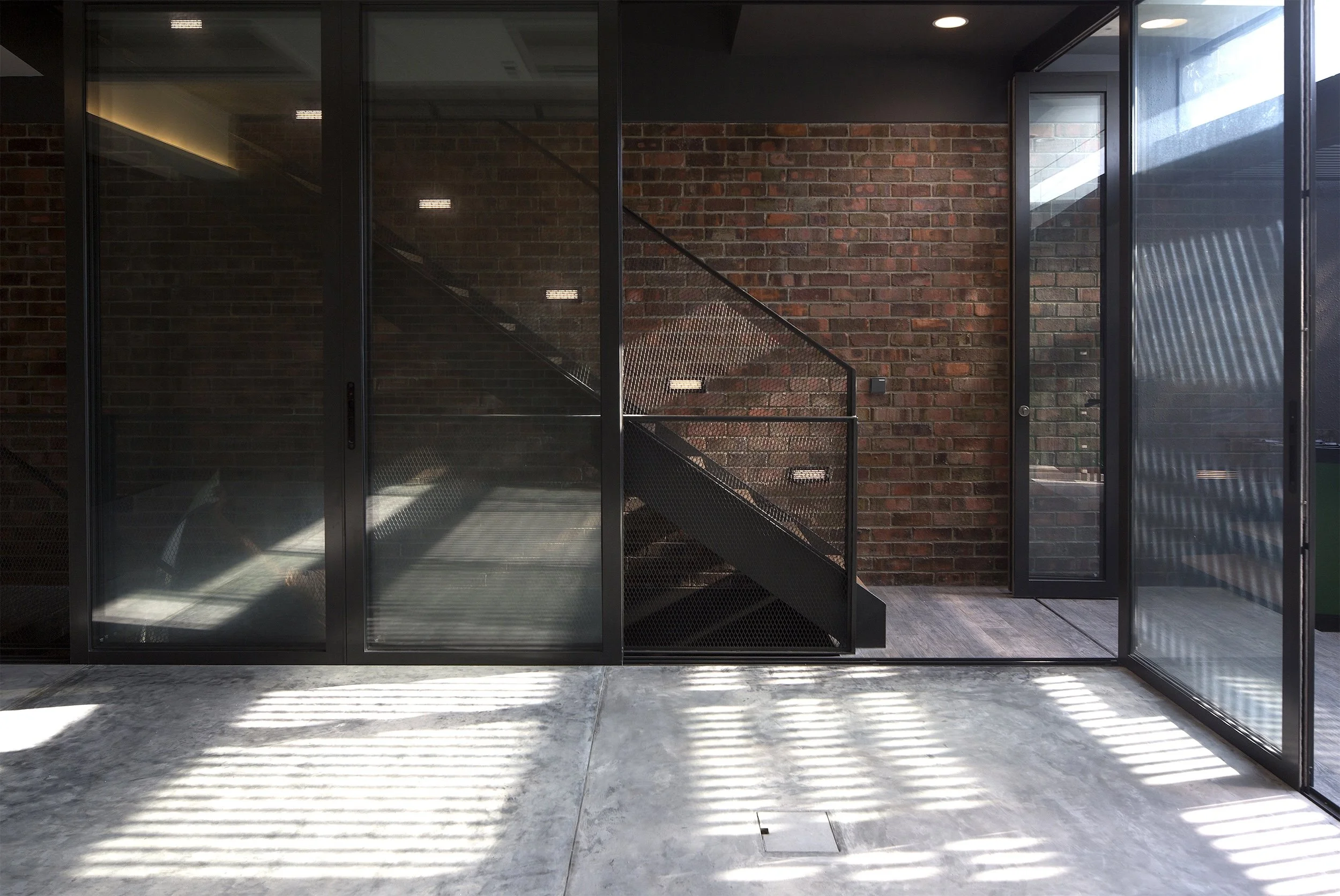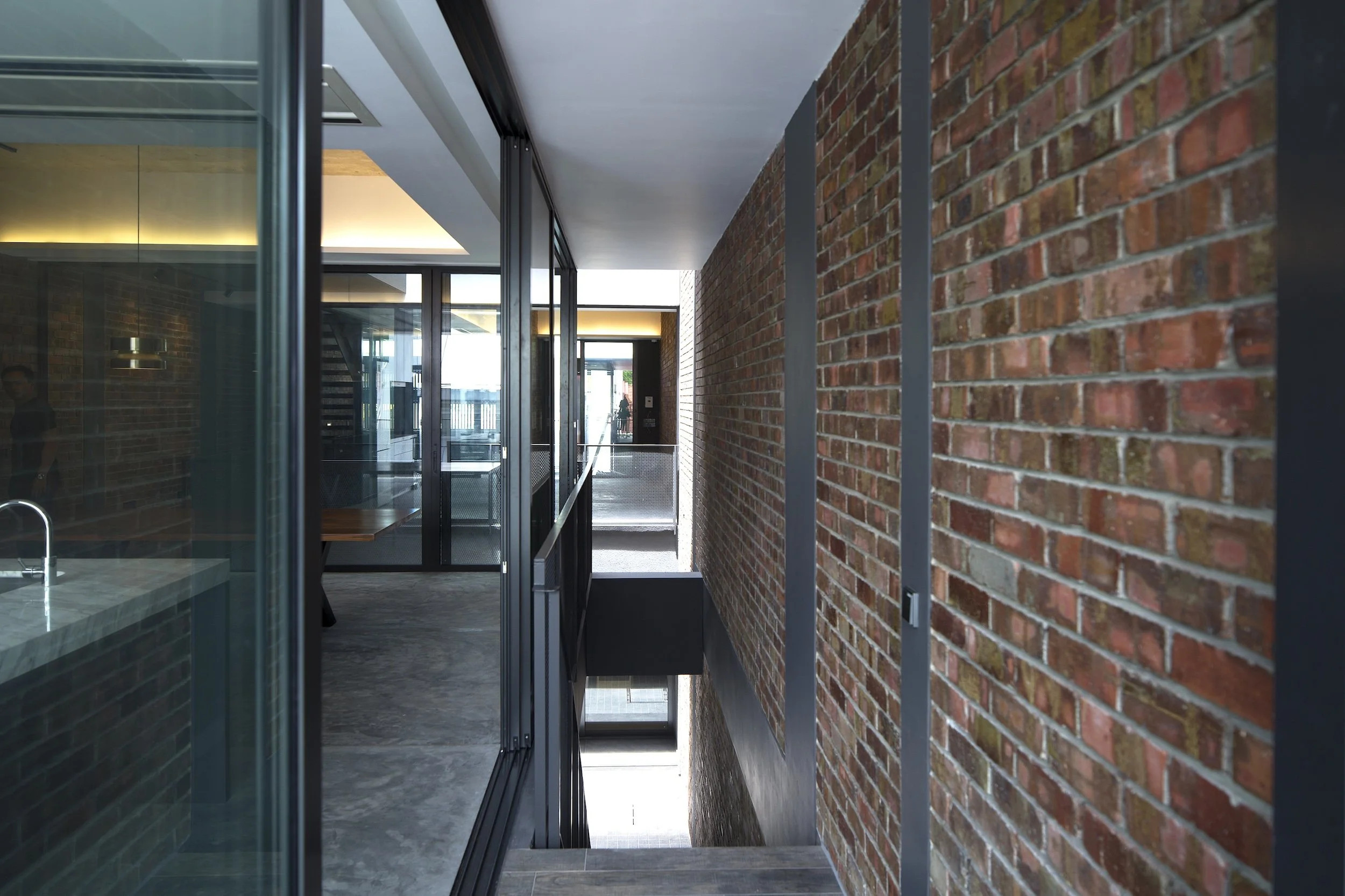 Service areas were delinked and pushed one floor below, linking back to the dining area above via a dedicated service staircase. This frees the first storey of opaque elements and establishes a clear line of sight through the length of the house. Brick-lined party walls frame a transparent interior, evoking feelings of walking through laneways and arcades.