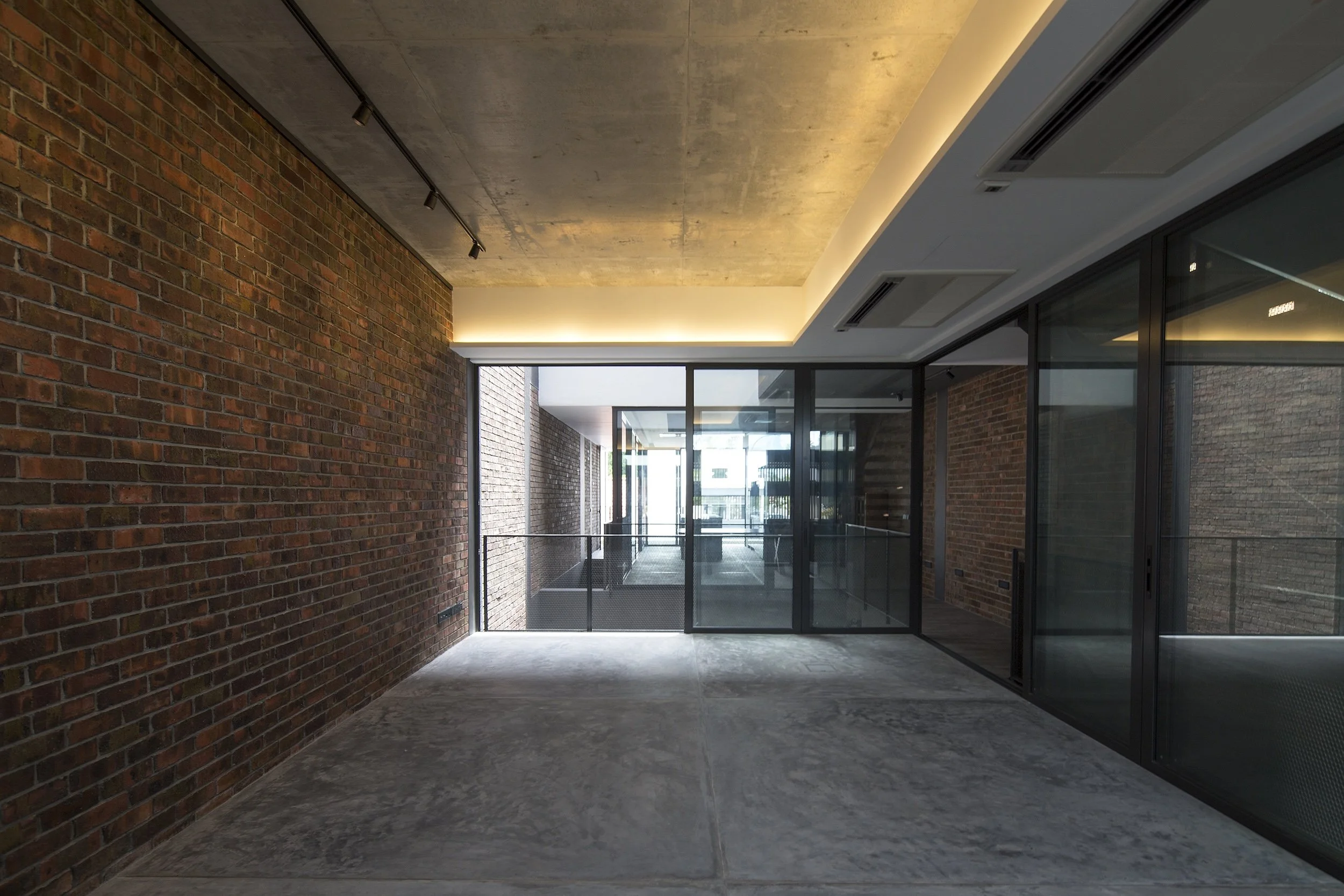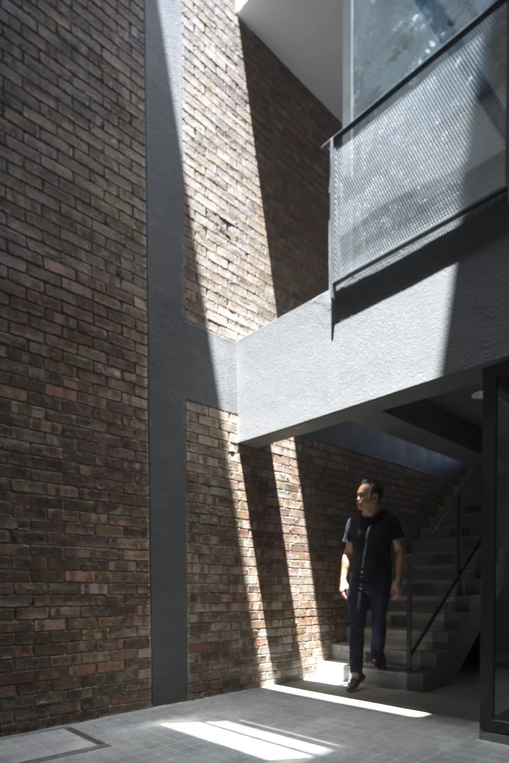 The communal living and dining spaces were designed as a collection of individual rooms enclosed by full-height sliding glass doors, arranged across the first storey within the clinker brick-lined volumetric confines of the plot. Only within these glass enclosures are air-conditioning provided. Circulation is planned outside them — walkways and staircases are left naturally ventilated, reducing cooling loads and energy consumption.