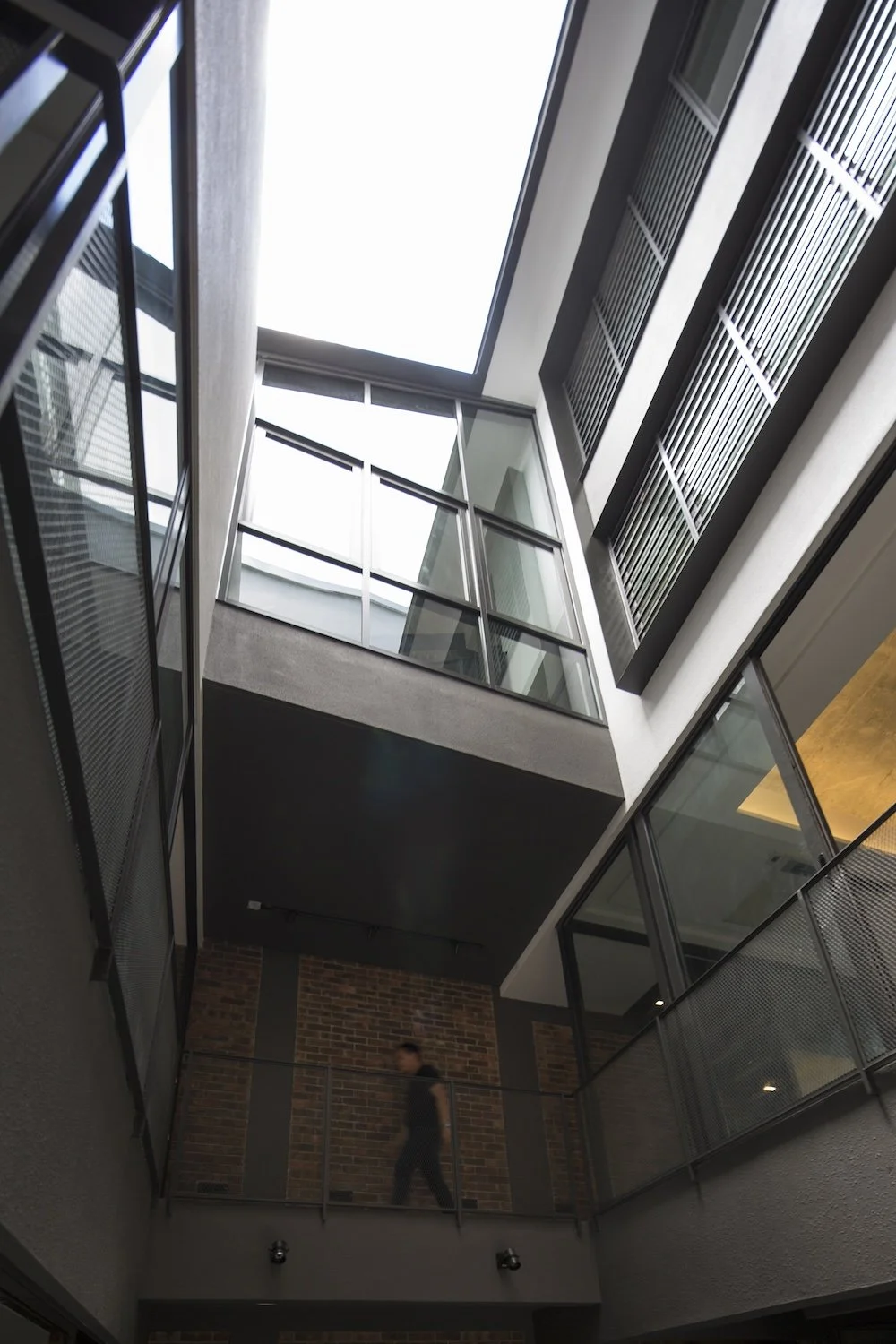 To further induce better airflow, Bernoulli's Principle was studied and adapted. By offsetting the glass boxes to opposite sides of the party walls, the ventilation slots are no longer in line but staggered. Together with the courtyard in the middle, a through kinked air passage results. Air moves through faster across the narrow slots and slows down at the centre, creating a pressure difference within the system that induces stronger breezes though the house.