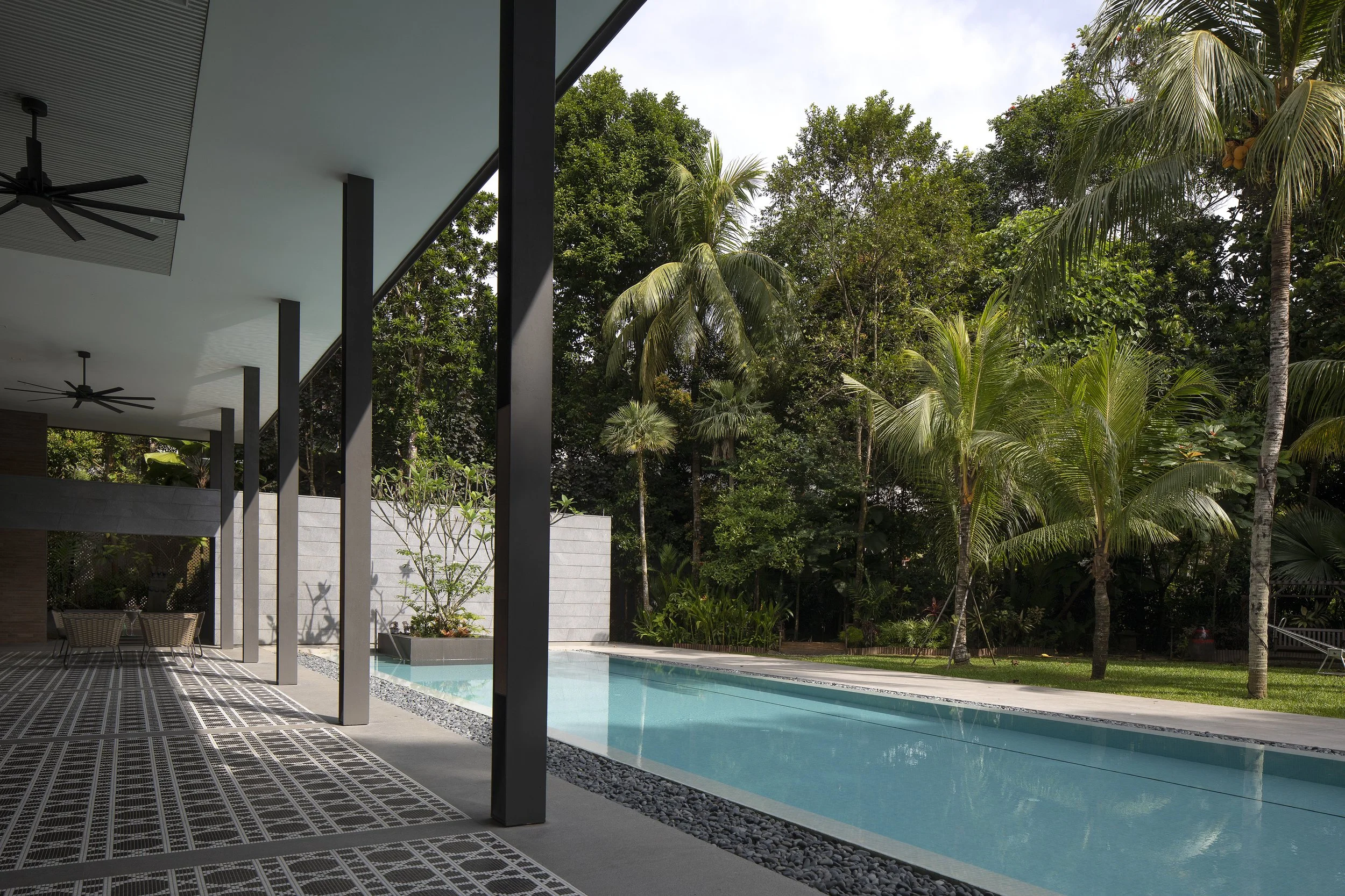 Interfacing with the main house, a new open linear verandah now spans the length of the reconfigured pool. Comfortably accommodating up to 10 banquet tables, it consolidates previously scattered entertainment spaces literally under one roof. With a generous 4.5m roof height, it preserves sightlines from the main house to the garden. The new pool, now a slimmer 5 by 22m, allows more green space to be reclaimed by the lawn, reinstating its original scale.