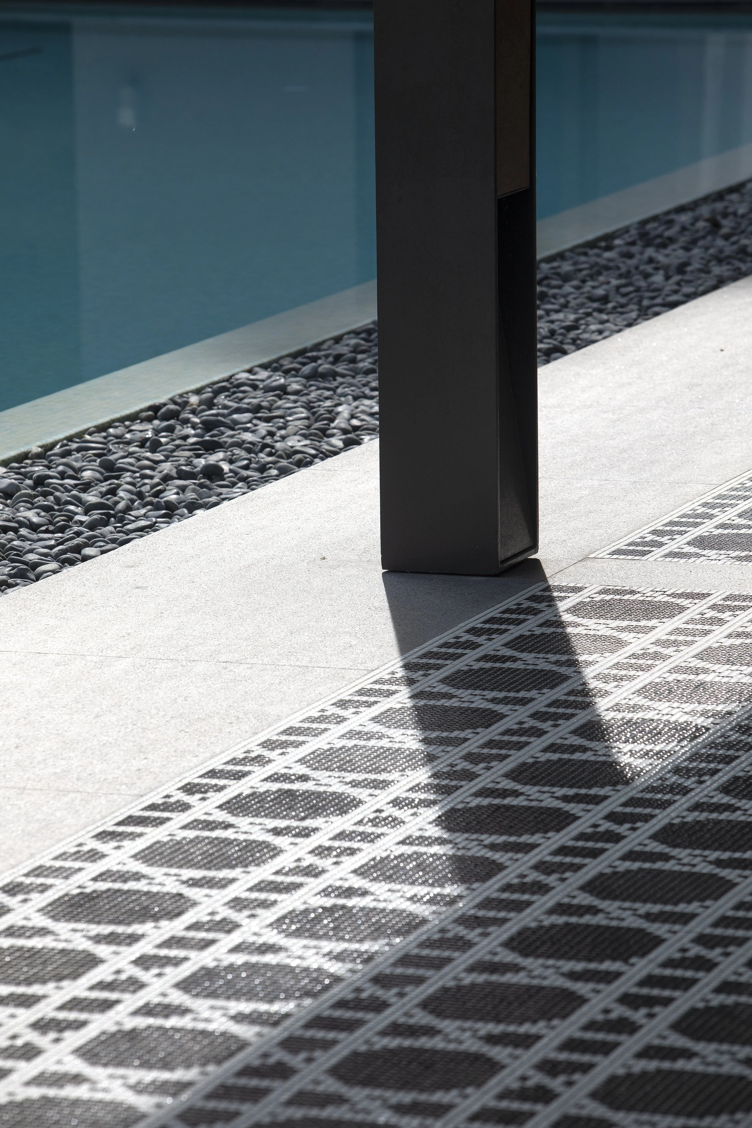 Aesthetic details are often costly and are mostly eschewed in favour of robust construction detailing. Exceptions are made for when they can bring something meaningful to the project. Here, slanted joints within the granite feature walls pay subtle homage to the family’s tyre business roots, a little nod which is often pointed out with pride to guests. Touches like these reflects a larger ethos of thoughtful and personal architecture.