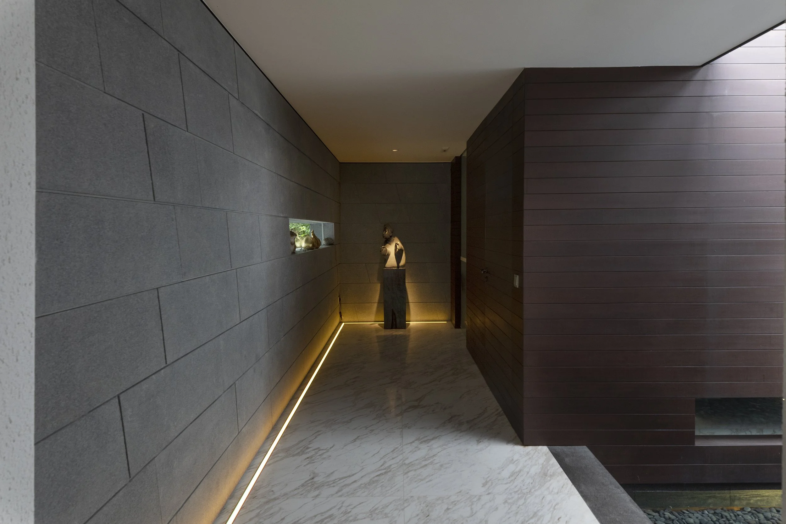 Slit windows at different levels allow for passive surveillance of the main gate and offer glimpses of the water from the powder room, expressed as freestanding timber box floating on the fish pond.