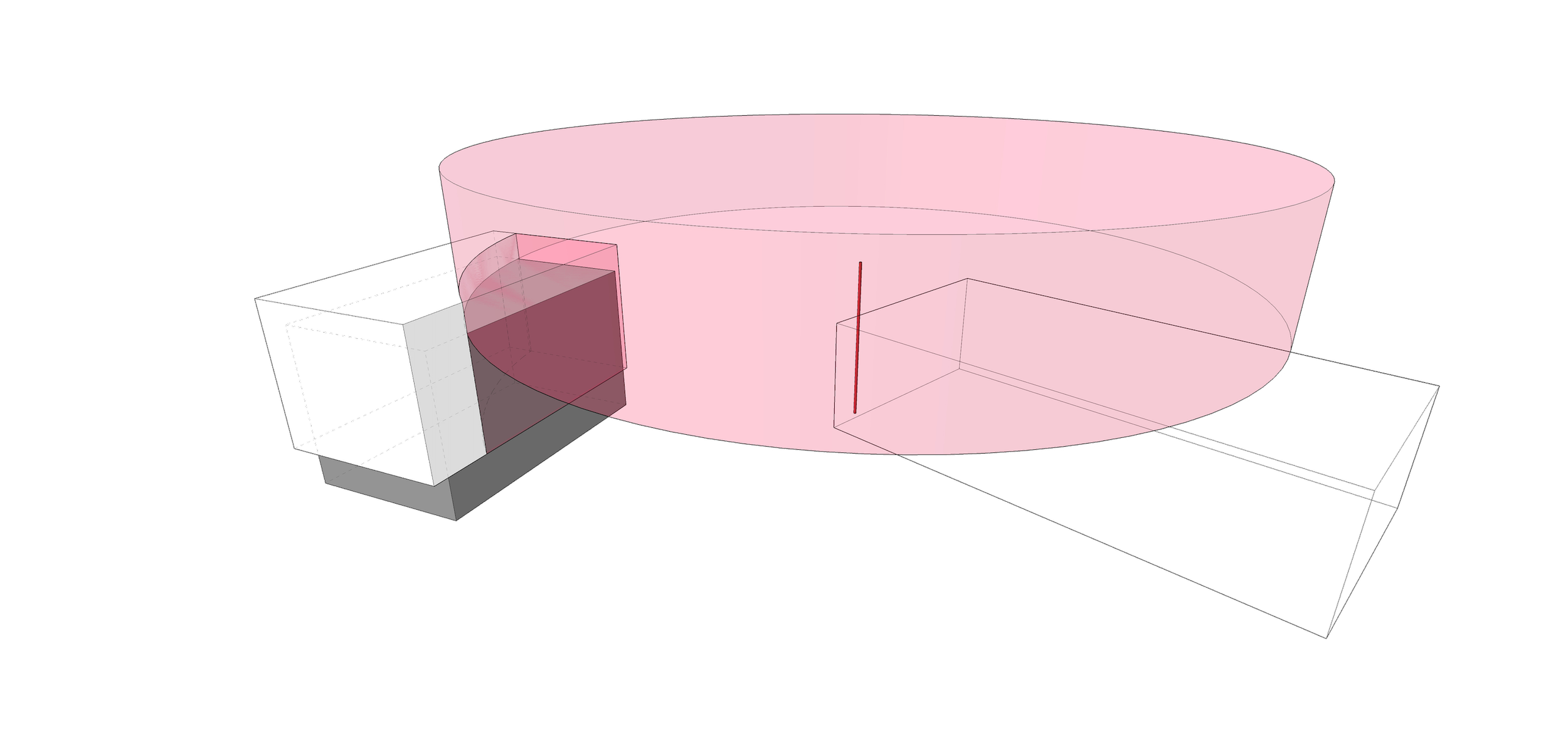 Behind the site stands a food factory with a chimney. NEA guidelines stipulate a 100m radius about the chimney, within which buildings must be 3m lower. This radius cut into half of our already maximised building footprint. Parts of the taller white cuboid encroached into it.