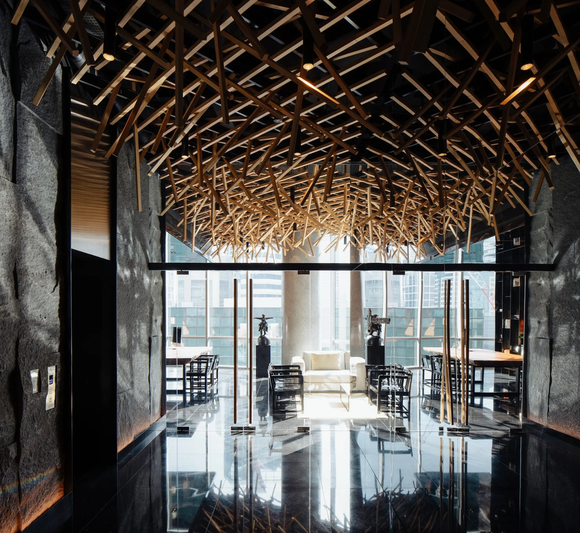 The seemingly messy and random bird nest ceiling was rigorously rationalized into a simple system of a few modules of meticulously detailed pine wood strips.