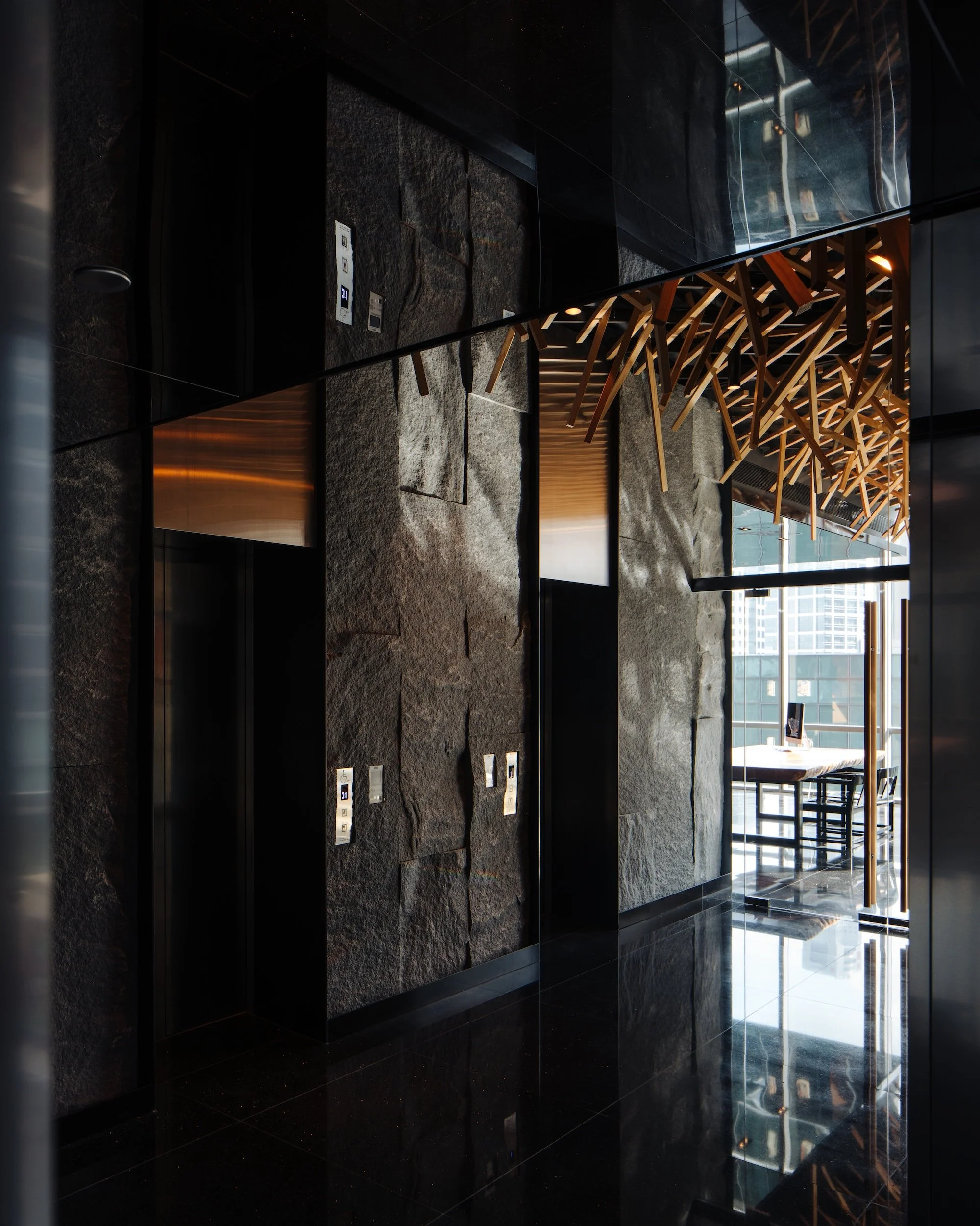 Edgeless mirror stainless steel panels sheath the staff office ‘cube’, rendering it invisible amidst the luxe palette of glass, steel, wood and stone. Multiple reflections of the different types of light and surfaces both expands the perception of space and imbues it with a sense of depth that belie its modest dimensions.