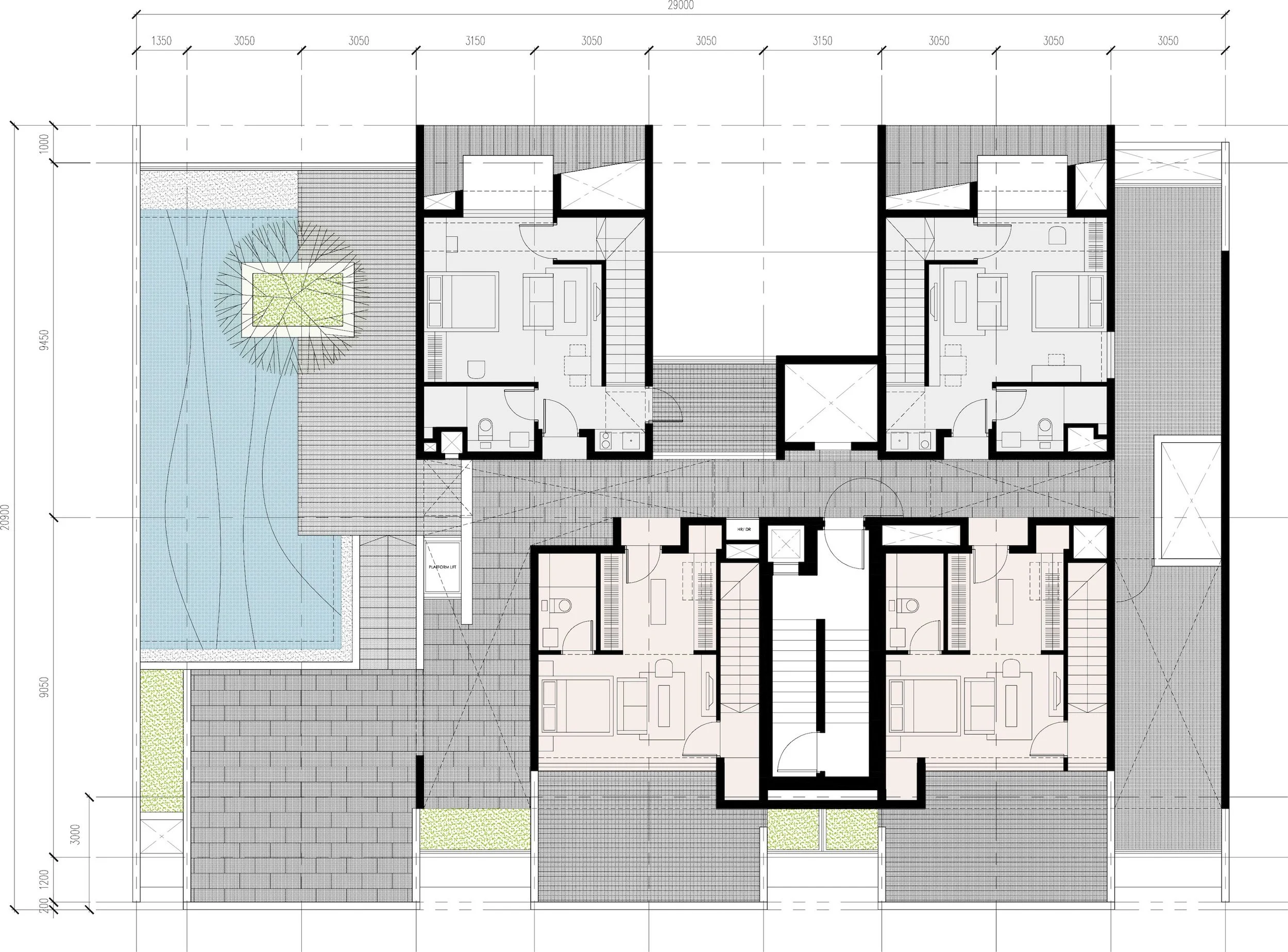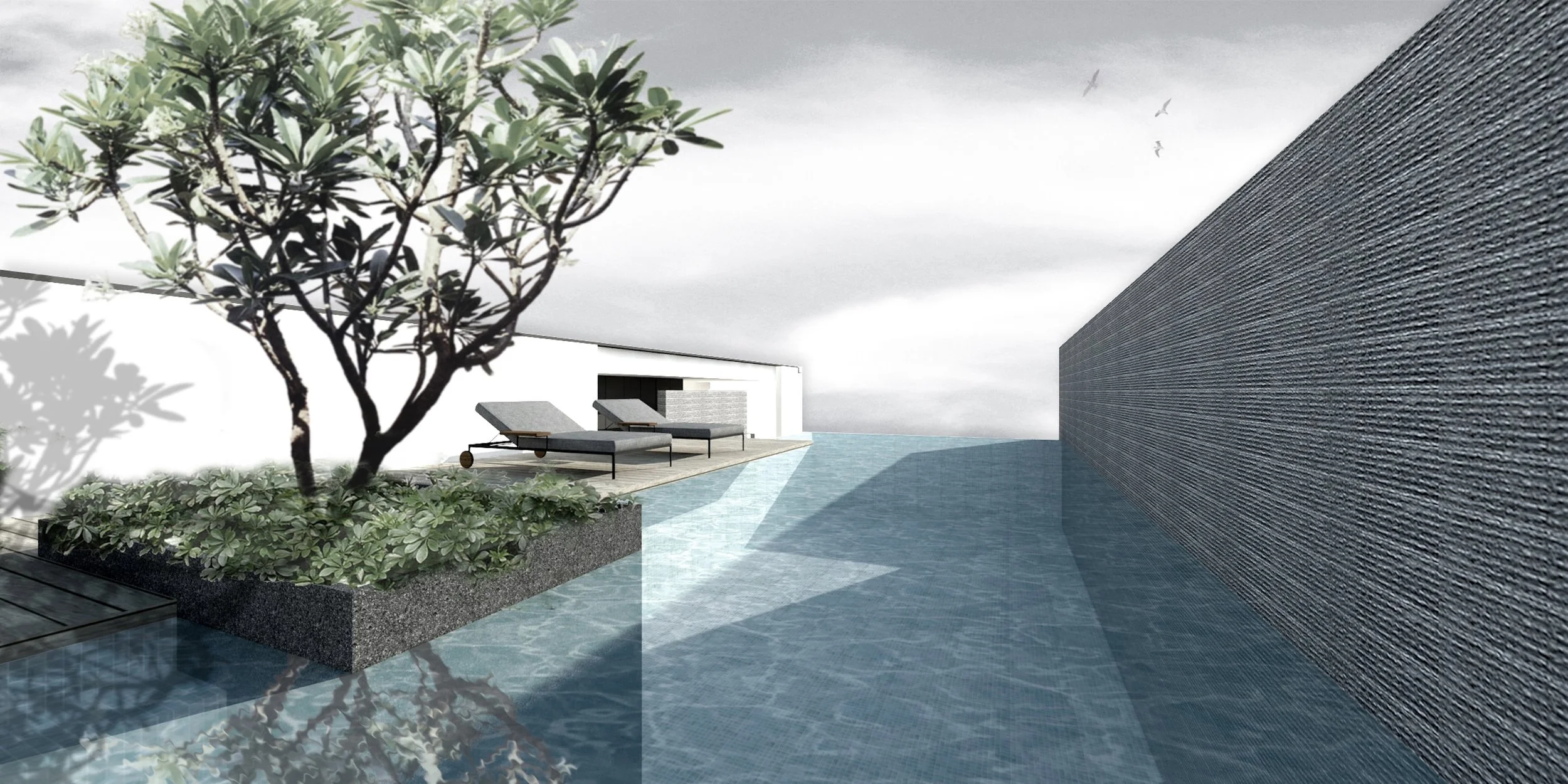 Designed to accommodate three commercial shops at street level and 24 compact residential units above, the scheme culminates in a rooftop infinity swimming pool and communal terraces that offer residents visual and spatial relief within a dense urban fabric.