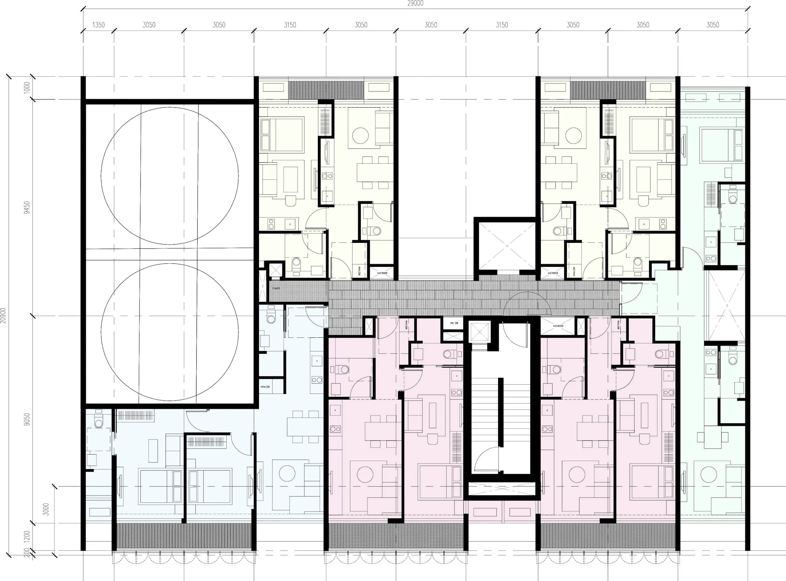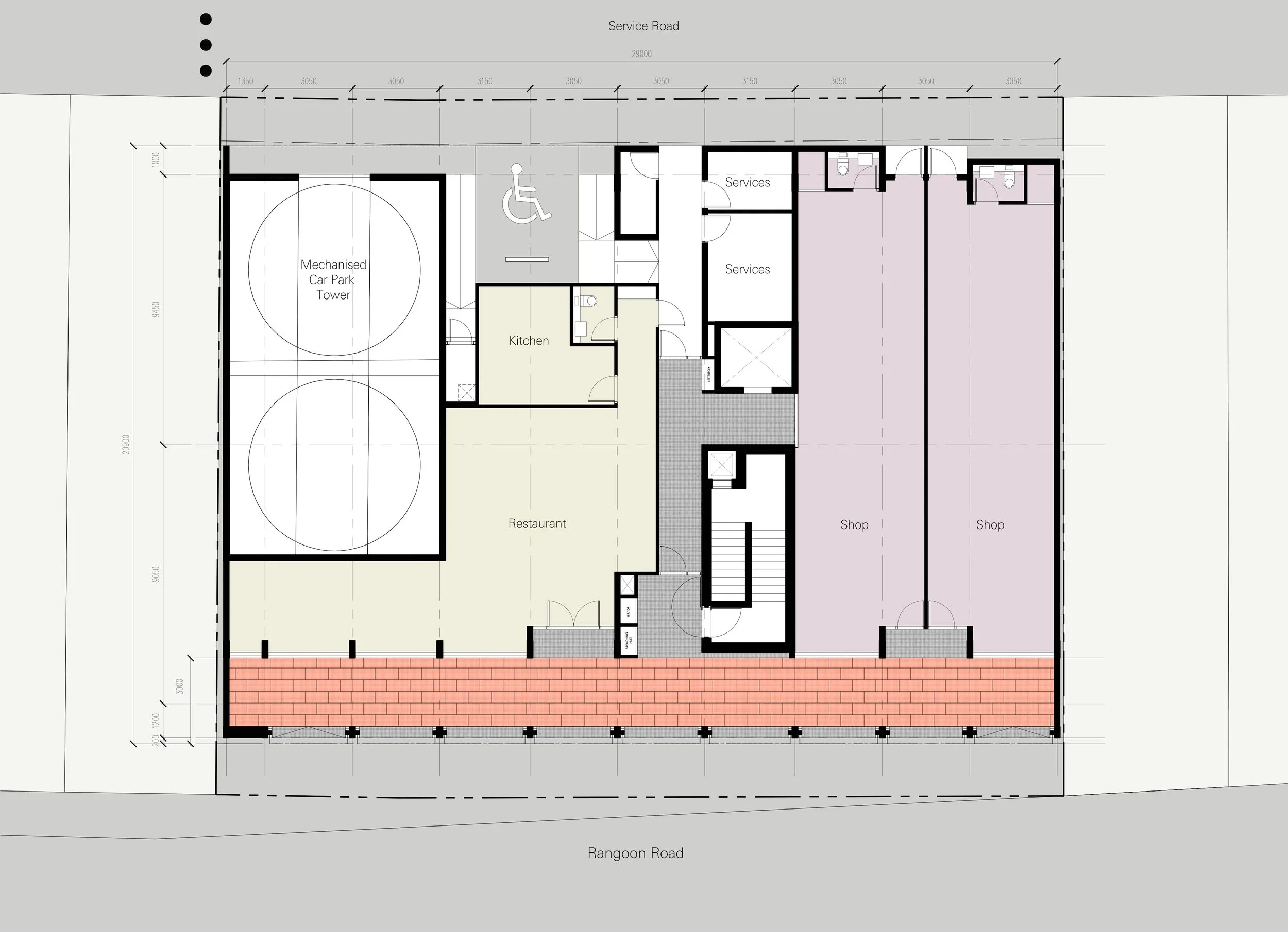 The first storey manifests as a grounded datum. Housing the retail units, residential lift lobby and services, it is fronted with a sheltered terracotta tiled five-foot way that stitches seamlessly into the broader pedestrian corridor network mandated by local urban design guidelines. The colonnaded arcade presents the civic face of the building, its portals framed with stepped profiles of black metal – a modern echo of the same traditional masonry detail not uncommon in black and white bungalows.