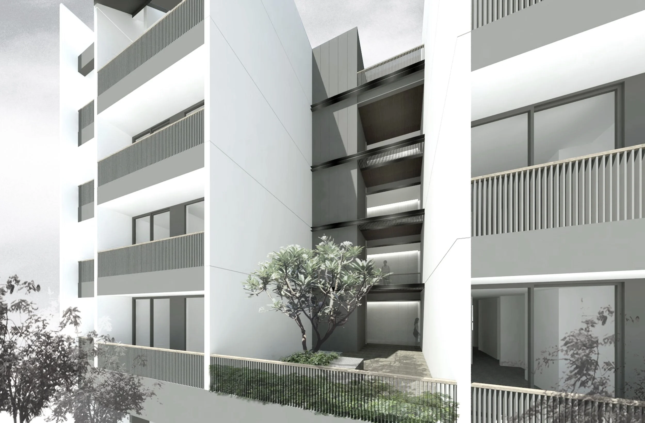Above, the upper levels are articulated as three slender vertical towers of operable metal shutters, extending the rhythm of the adjacent shophouses. Apartments are fronted by shutters-screened balconies, buffering them from the noise and bustle of the main road while allowing individual modulation of privacy, shade, and views.