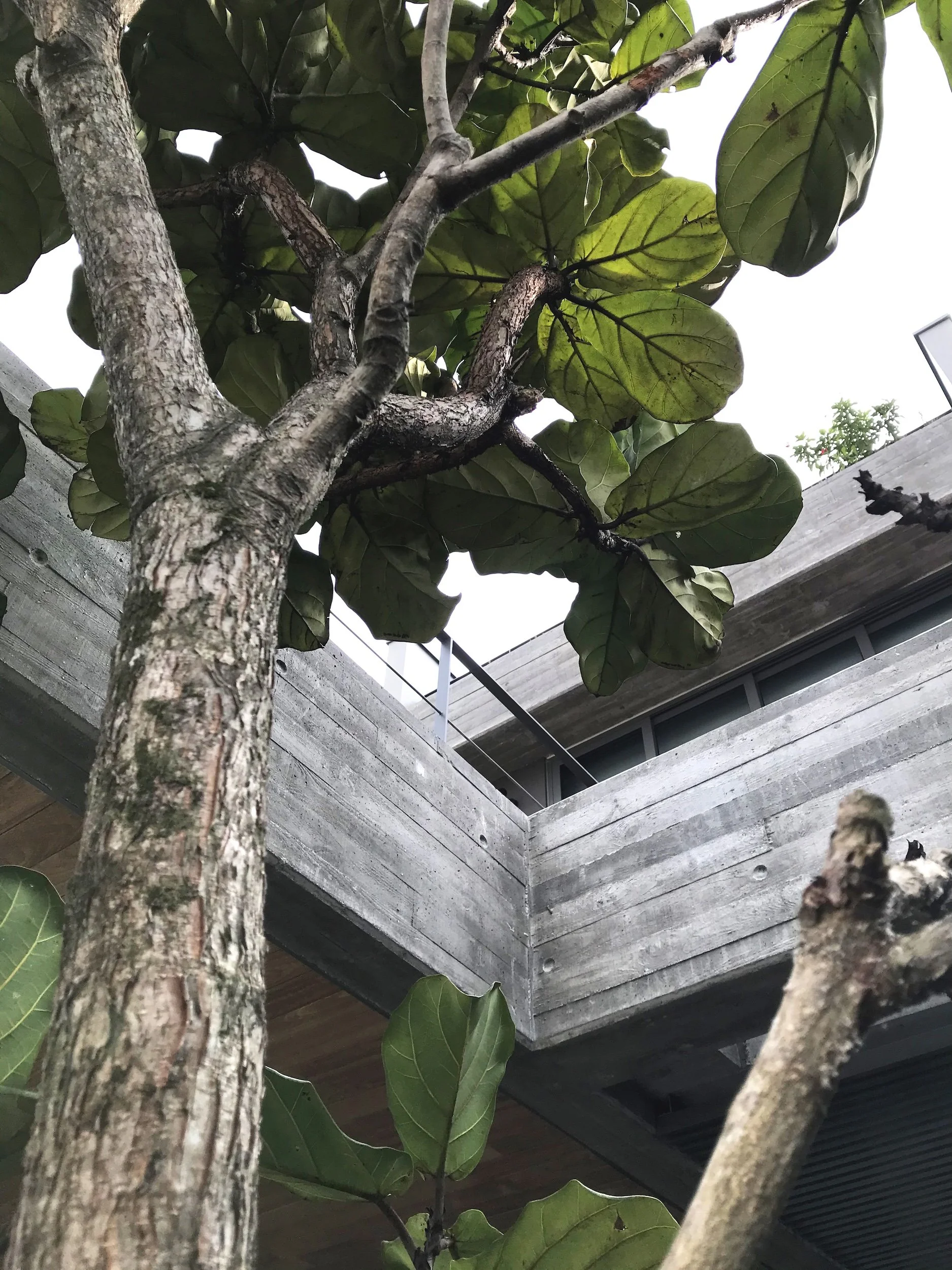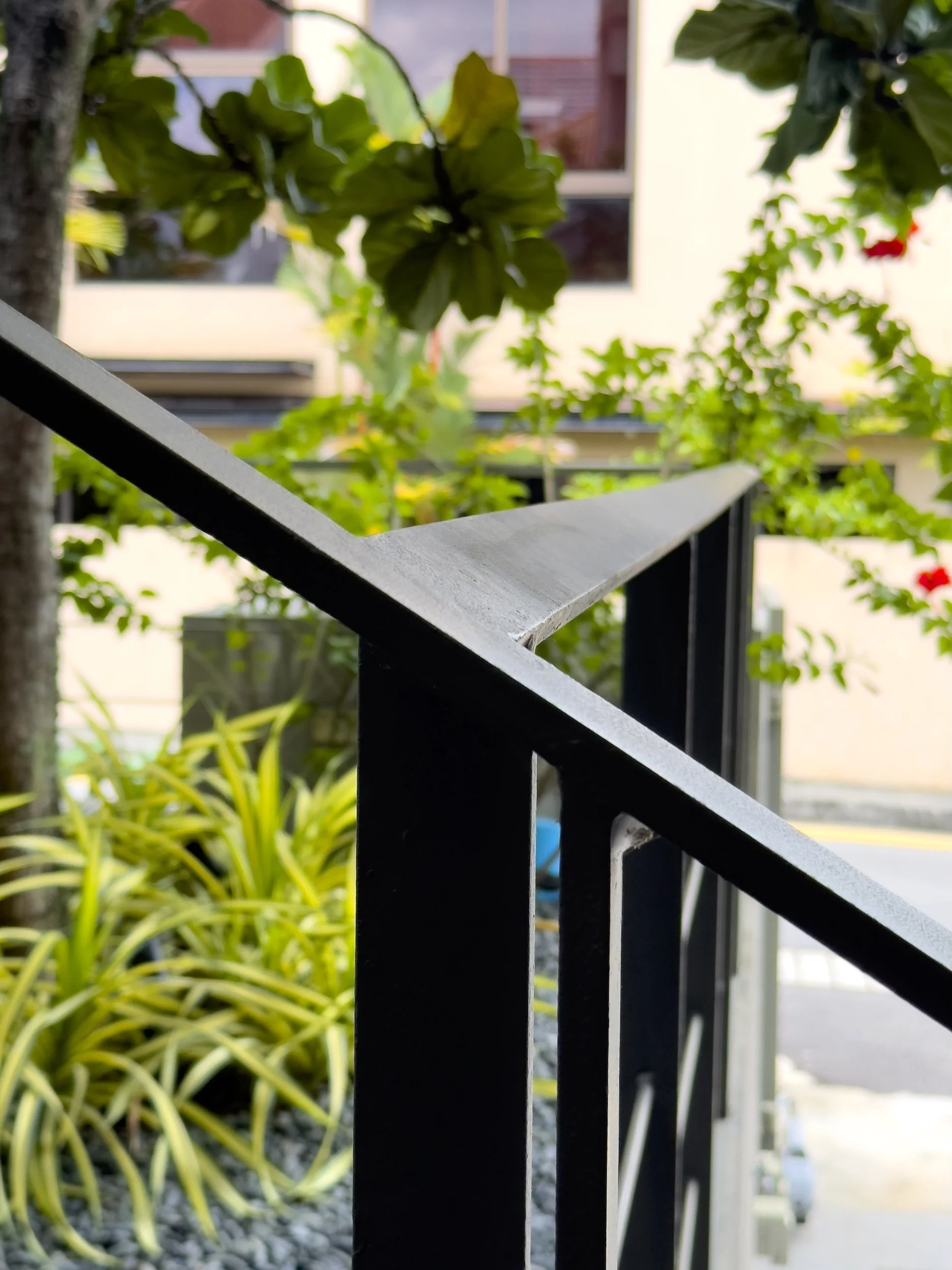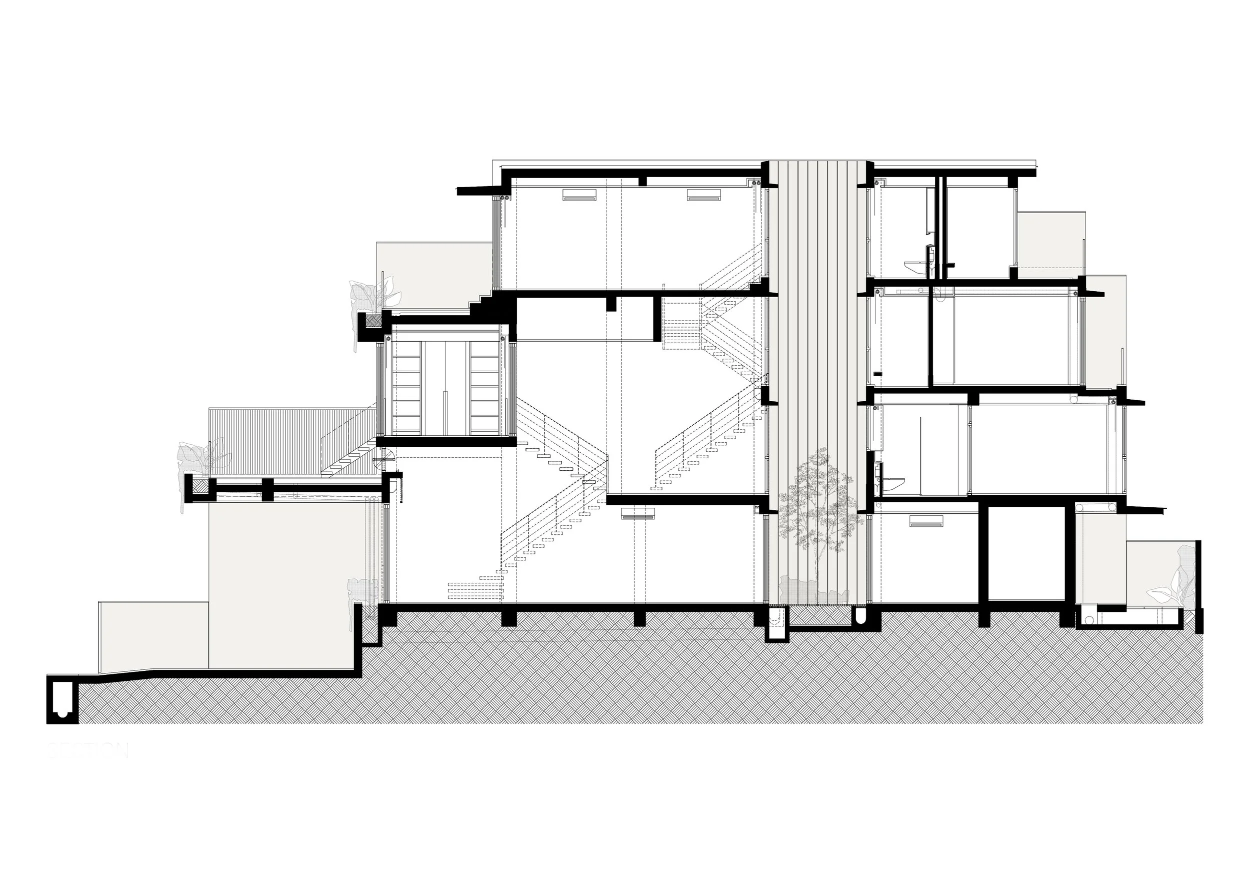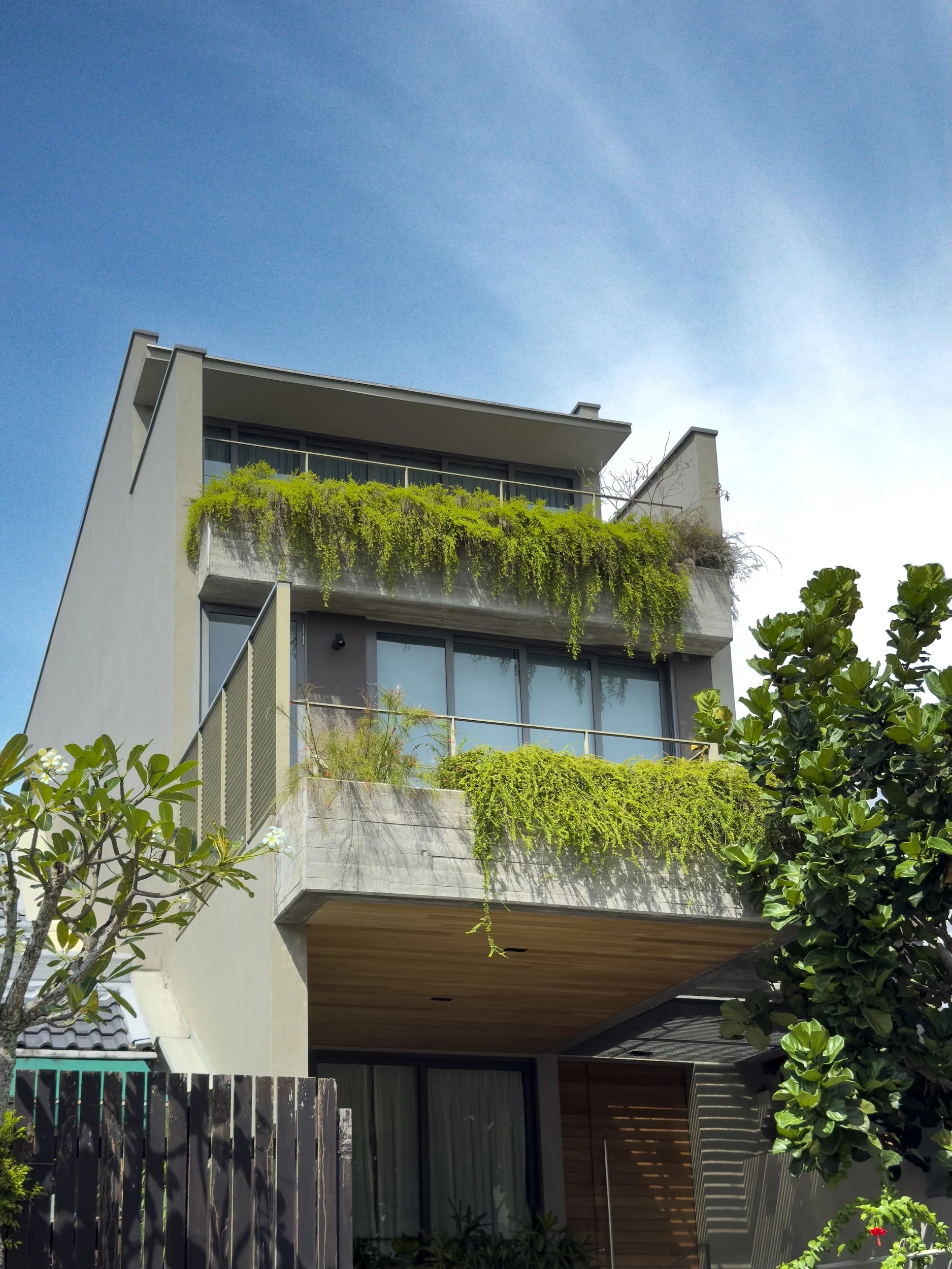 Externally, board-formed concrete is sparingly used only for the front planters. The rest of the external walls are finished in a concrete-lookalike paint for a monolithic expression, forming a neutral backdrop for the façade greenery.